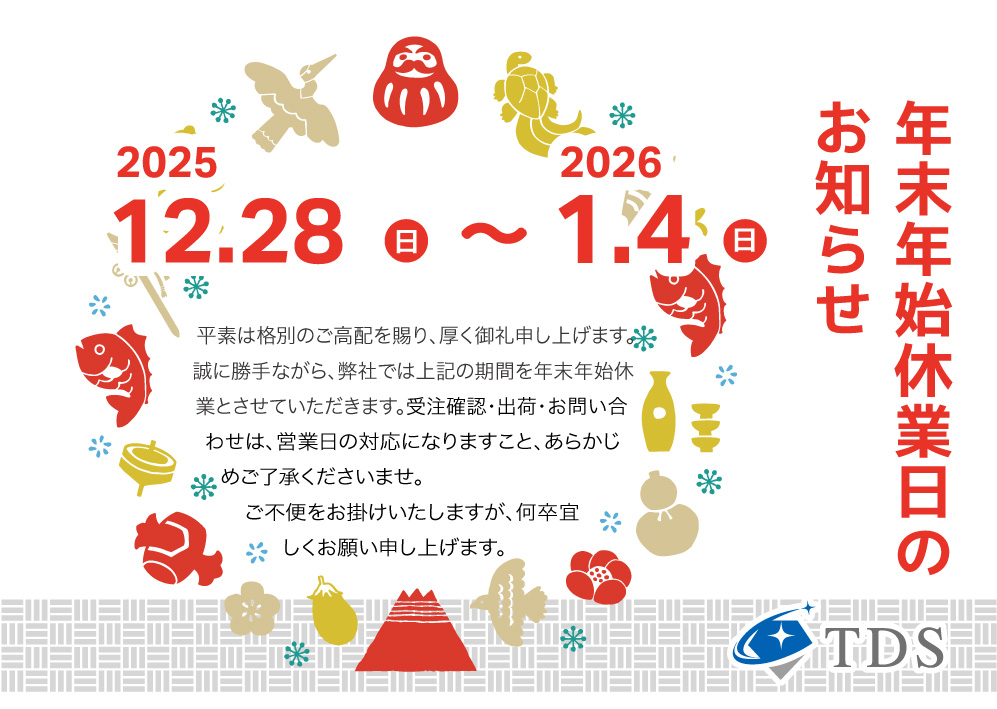 年末年始休業日のお知らせ HOMEお知らせ年末年始休業日のお知らせ <年末年始休業日のお知らせ> 平素は格別のお引き立て賜り、誠にありがとうございます。 弊社では上記日程の通り年末年始休業とさせていただきますことをお知らせいたします。 受注確認、出荷、お問い合わせのご返答は、営業日に対応させていただきます。 順にご連絡を必ずさせていただきますが、ご返答にお時間をいただく場合がございます事をご了承くださいませ。 お客様には大変ご不便をお掛けいたしますが、何卒よろしくお願いいたします。